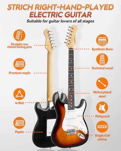 STRICH Electric Guitar Beginner Kit, Solid Body 39″ Full Size Electric Guitar SSS Pick Up for Starter, with 5W x 2 Amp, Bag, Digital Tuner, Capo, Strap, String,Cable, Picks, SST-S10 Sunburst