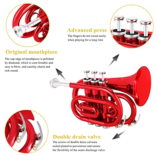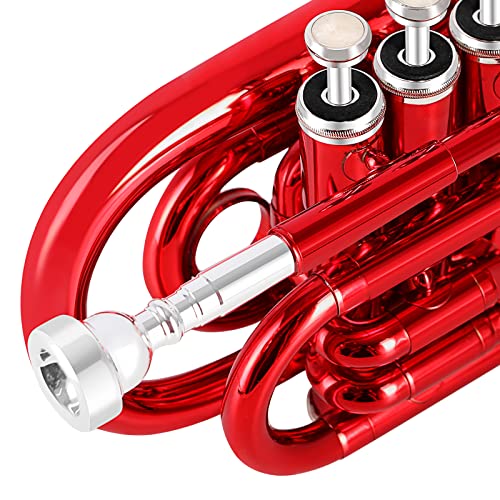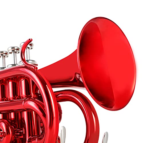 EASTROCK Pocket Trumpet Brass Bb Mini Trumpet with 7 C Mouthpiece, Hard Case, Strap, White Gloves, Cleaning Kit for Students and Beginners(Red)