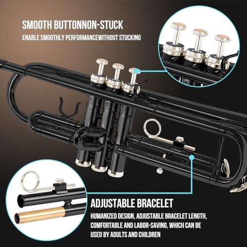 🎁【Suitable for Everyone】The trumpet set includes B flat Trumpet, White Gloves, Cleaning Suit, 7C Mouthpiece, Hard Case and cleaning set. 7c mouthpiece blowing effortlessly, penetrating tone, smooth valves, easy to play, Also a user-friendly brass instrument for beginners and students.