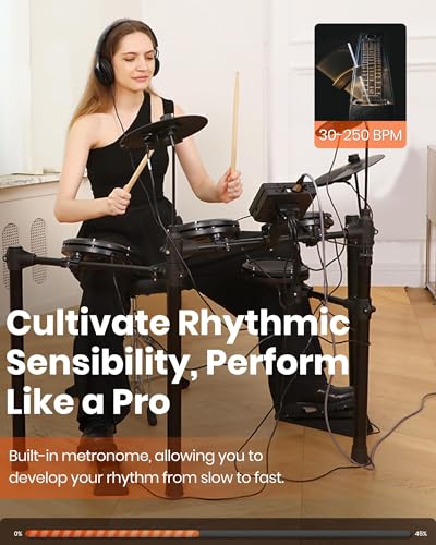 Advanced Pratice Modes & Metronome Features: This electric drum kit offers advanced practice modes with real-time evaluation to enhance your sense of rhythm and build endurance. With 3 practice modes and adjustable tempo, you can tailor your sessions to your needs. The built-in metronome provides a range from 30 to 250 beats per minute, and the drum module’s display screen tracks your performance and progress specifically in practice mode. Additionally, the recording function helps you identify areas for improvement, refine your skills, and build a solid foundation for your drumming journey.