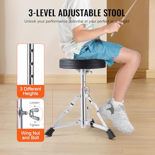 Height-Adjustable Drum Throne: Designed with four levels of height adjustment, you can simply adjust the positioning bolt lock to your desired height and secure it in place, providing a more tailored and comfortable experience than traditional fixed-height drum thrones. You’ll always find the perfect seating position for your drumming journey.