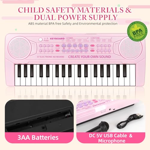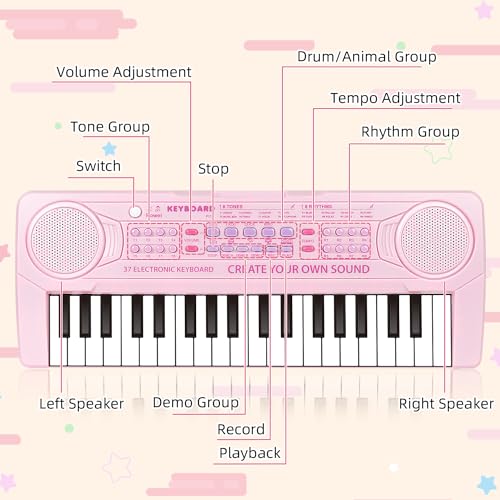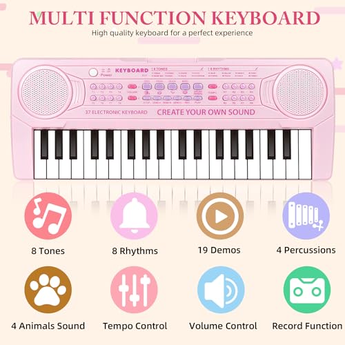 [37 Keys Keyboard Piano] This 37-key kids electronic piano keyboard has 8 rhythms, 8 tones, 11 demos, 4 percussion instruments and 4 animal sounds, recording and playback functions, allowing your children learn a musical instrument easily while playing.