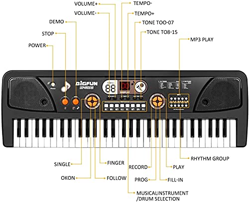 【MP3 Play Function & LED SCREEN】 TWFRIC musical piano toy features LCD Screen+ 16 Tones+ 5 Rhythms + 6 Demos + 8 Percussions + Record + Play + Single Finger + Finger Chord + Follow + One Key for One Note + Fill-in + Program + Volume Control + Tempo Control + SINGLE SPEAKER Design. And you can connect your U-disk to play the songs you want, can be used by children or adults and makes a great first musical instrument.