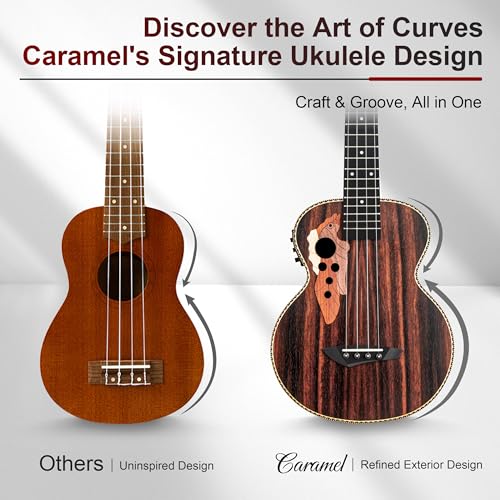 UNMATCHED UKULELE – 3 bands EQ built in tuner with LCD color display,ready this one-of-a-kind acoustic-electric for natural-sounding sound reproduction into an amp, PA, or recording medium.! Caramel ukalalee sounds almost like a pricey professional Ukulele. Luthiers tuned it one by one before we ship your ukulele out,no worries for beginers player or kids either.
